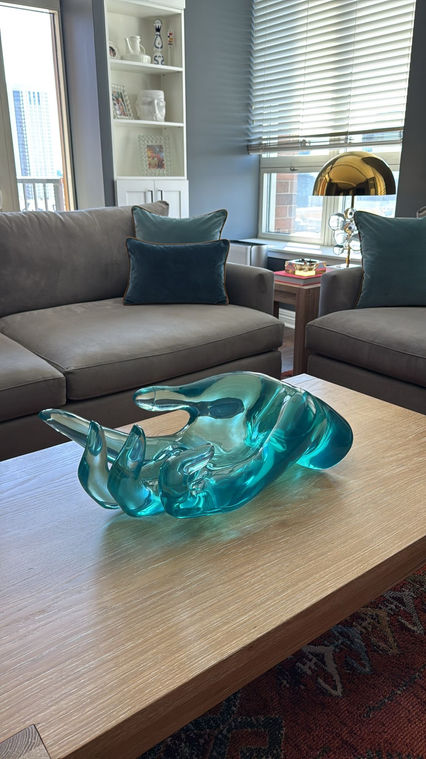 Explore the modern living spaces with sleek designs and vibrant accents. From the minimalist bedroom with a large window to the living room with gray sofas and abstract glass sculpture centerpiece.